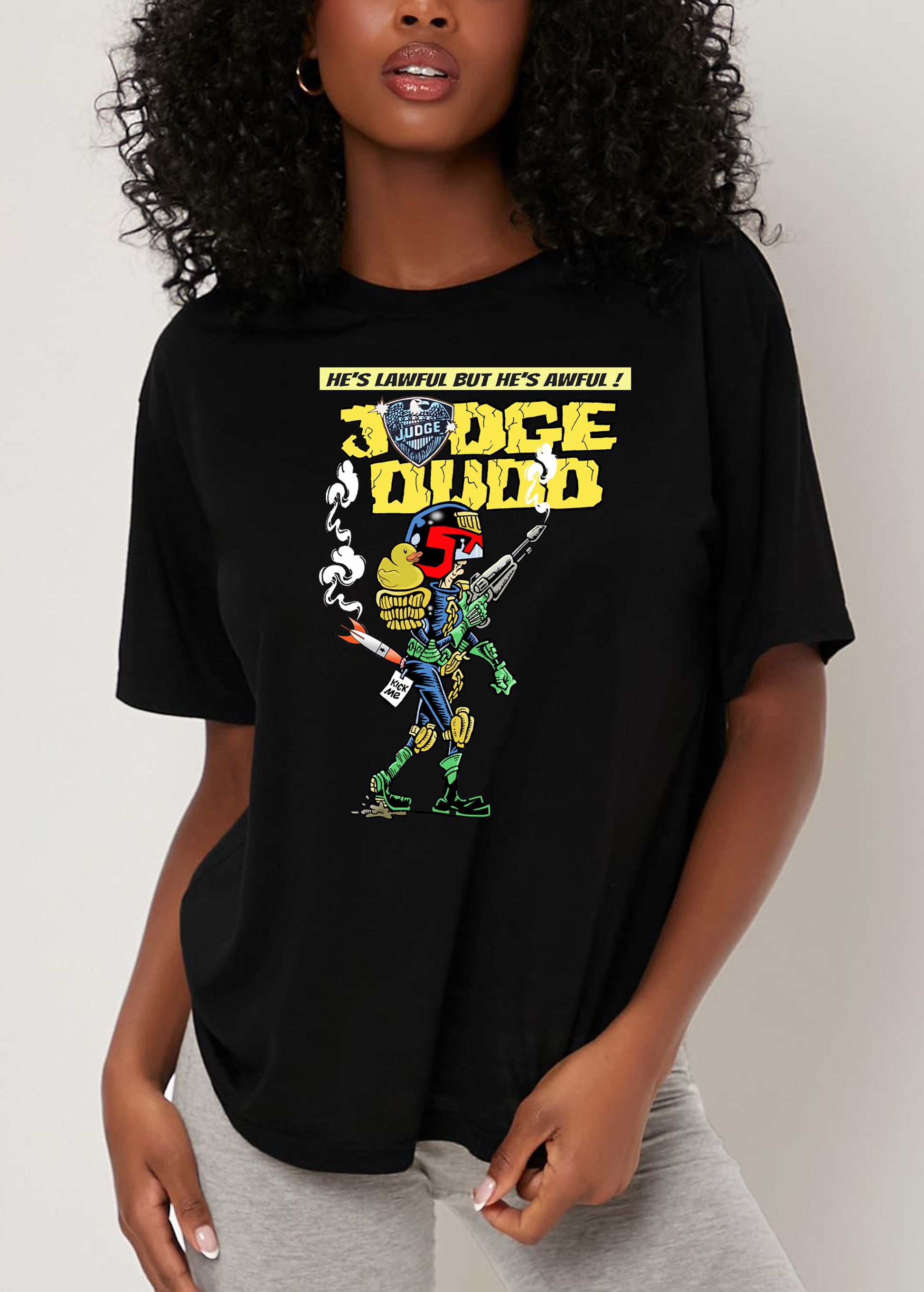 short sleeve tee in black with original Mark Bennington design of Judge Dudd character